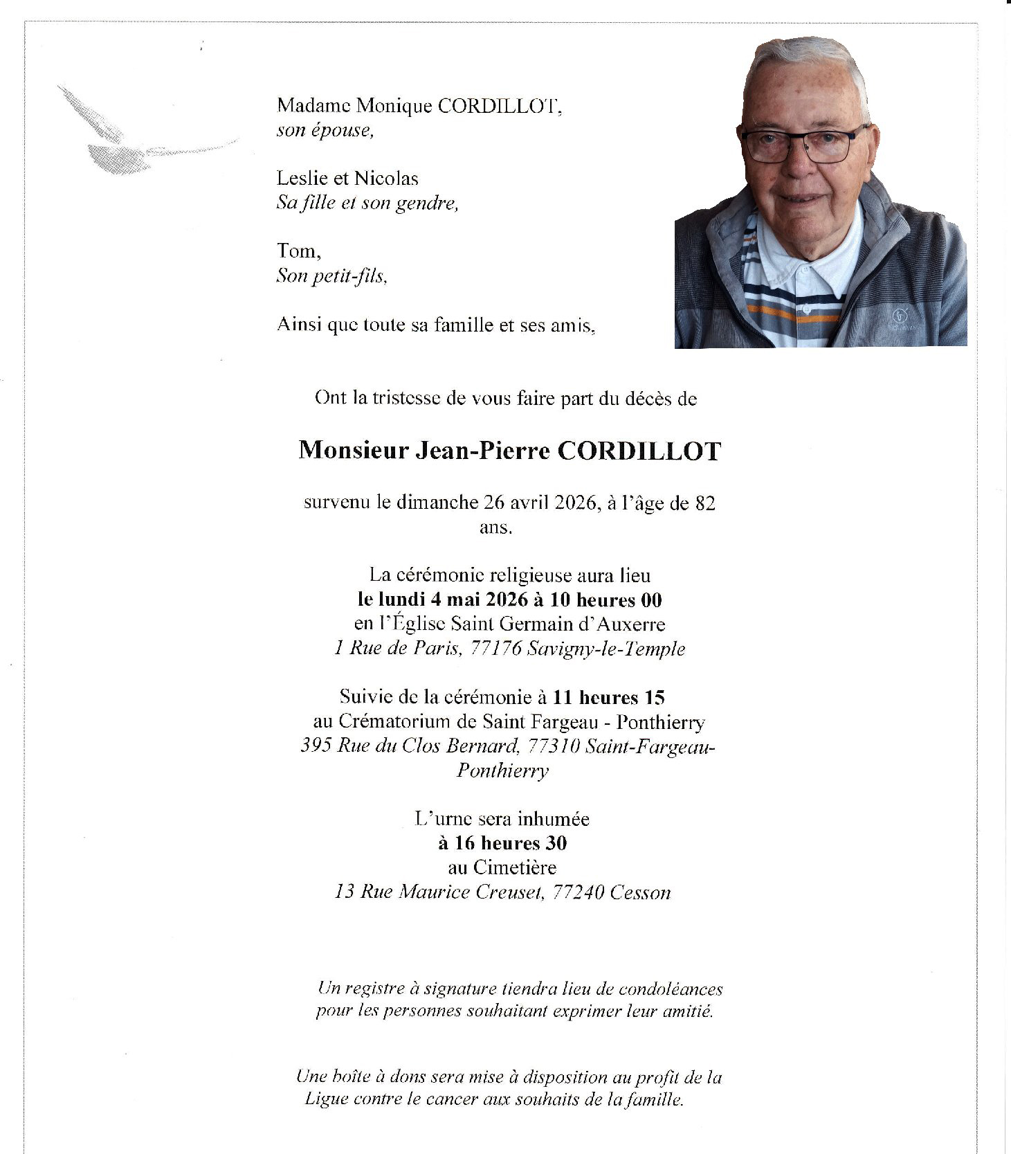 Nous avons le regret de vous faire part du décès de notre ami et trésorier Jean-Pierre Cordillot